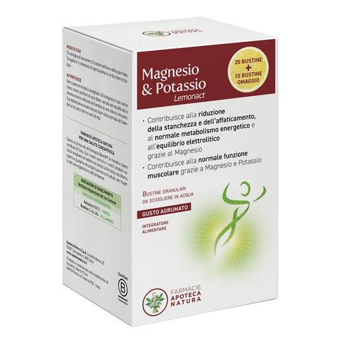 Magnesio & PotassioLemonact Descrizione Integratore alimentare. Grazie all’apporto di magnesio contribuisce alla riduzione della stanchezza e dell’affaticamento, al normale metabolismo energetico, alla normale sintesi proteica e all’equilibrio elettrolitico. Il potassio, che contribuisce al mantenimento di una normale pressione sanguigna. Inoltre magnesio e potassio in sinergia contribuiscono alla normale funzione muscolare e al normale funzionamento del sistema nervoso. Gusto agrumato. Ingredienti Zucchero di canna, Lemonact Cospray (limone succo concentrato - titolato in acidità totale come acido citrico monoidrato 23%, ...
